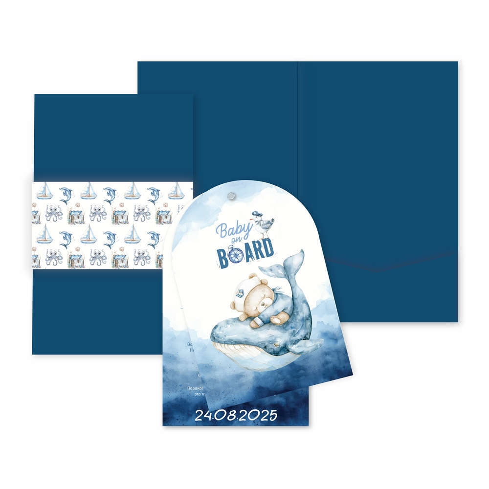 Το προσκλητήριο βάπτισης για αγόρι “Sailor Bear” φέρνει τη γαλήνη και τη μαγεία του ωκεανού στη σημαντική μέρα του μικρού σας. Με κεντρικό σύνθημα το "Baby on Board", το σχέδιο απεικονίζει ένα γλυκό αρκουδάκι ντυμένο ναύτη να κοιμάται προστατευμένο πάνω στην πλάτη μιας μεγάλης φάλαινας. Η χρωματική παλέτα κινείται σε κλασικές και μοντέρνες navy μπλε αποχρώσεις, δημιουργώντας μια αίσθηση ηρεμίας και κομψότητας. Οι εικονογραφήσεις σε στυλ ακουαρέλας προσδίδουν μια καλλιτεχνική πινελιά που ταιριάζει απόλυτα σε μια βάπτιση με ναυτικό θέμα. Το προσκλητήριο συνοδεύεται από ασορτί φάκελο με χάρτινη λωρίδα με pattern από θαλασσινά στοιχεία, ολοκληρώνοντας την παρουσίαση με τον πιο όμορφο τρόπο. Είναι η τέλεια επιλογή για γονείς που αναζητούν ένα διαχρονικό αλλά και παραμυθένιο προσκλητήριο, που συνδυάζει την παιδική τρυφερότητα με τη ναυτική παράδοση. Κάθε λεπτομέρεια εκτυπώνεται με κορυφαία ποιότητα, εξασφαλίζοντας ένα αποτέλεσμα που θα εντυπωσιάσει τους καλεσμένους σας.