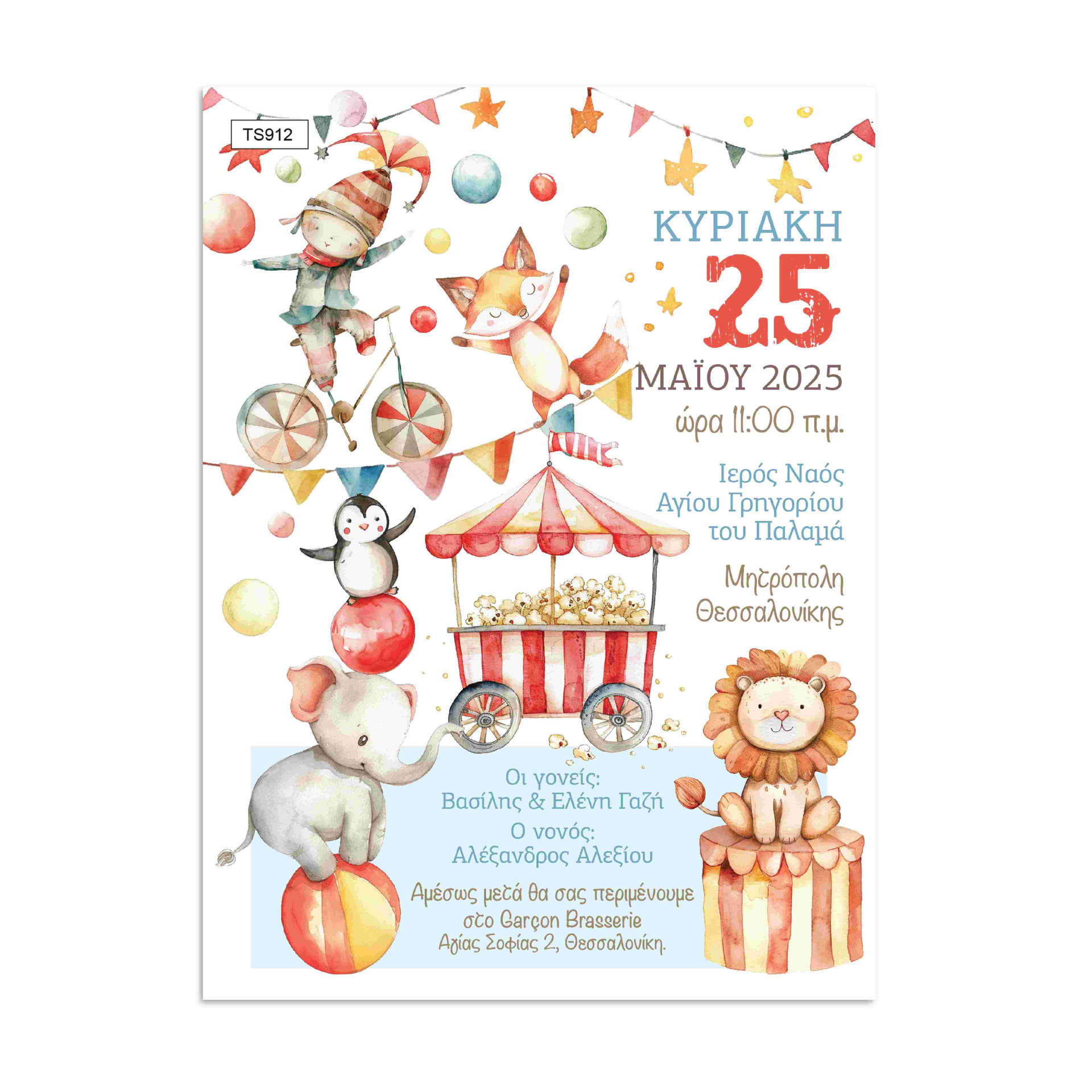 Χαρούμενο προσκλητήριο βάπτισης για αγόρι με θέμα ζωάκια στο τσίρκο. Πολύχρωμο, παιχνιδιάρικο και ιδανικό για ξεχωριστή βάπτιση.