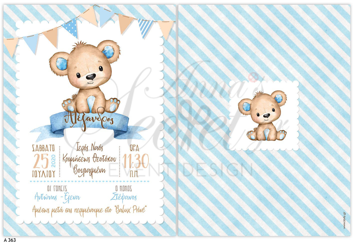 Προσκλητήριο βάπτισης για αγόρια με θέμα το αρκουδάκι, σε φάκελο με χρώμα της επιλογής σας. Το προσκλητήριο είναι μονόκαρτο με εκτύπωση και στις 2 όψεις. Διαστάσεις προσκλητηρίου : 15 x 20 cm