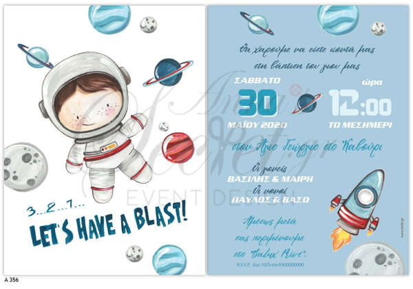 Προσκλητήριο βάπτισης για αγόρια με θέμα αστροναύτη, σε φάκελο με χρώμα της επιλογής σας. Το προσκλητήριο είναι μονόκαρτο με εκτύπωση και στις 2 όψεις. Διαστάσεις προσκλητηρίου : 15 x 20 cm
