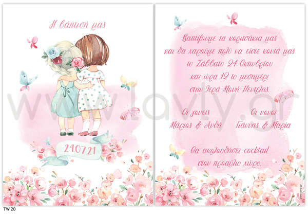 Ρομαντικό προσκλητήριο βάπτισης για κοριτσάκια, με φάκελο σε χρώμα της επιλογής σας. Το προσκλητήριο είναι μονόκαρτο με εκτύπωση και στις 2 όψεις. Διαστάσεις προσκλητηρίου:15 x 20 cm – Kωδικός :TW20