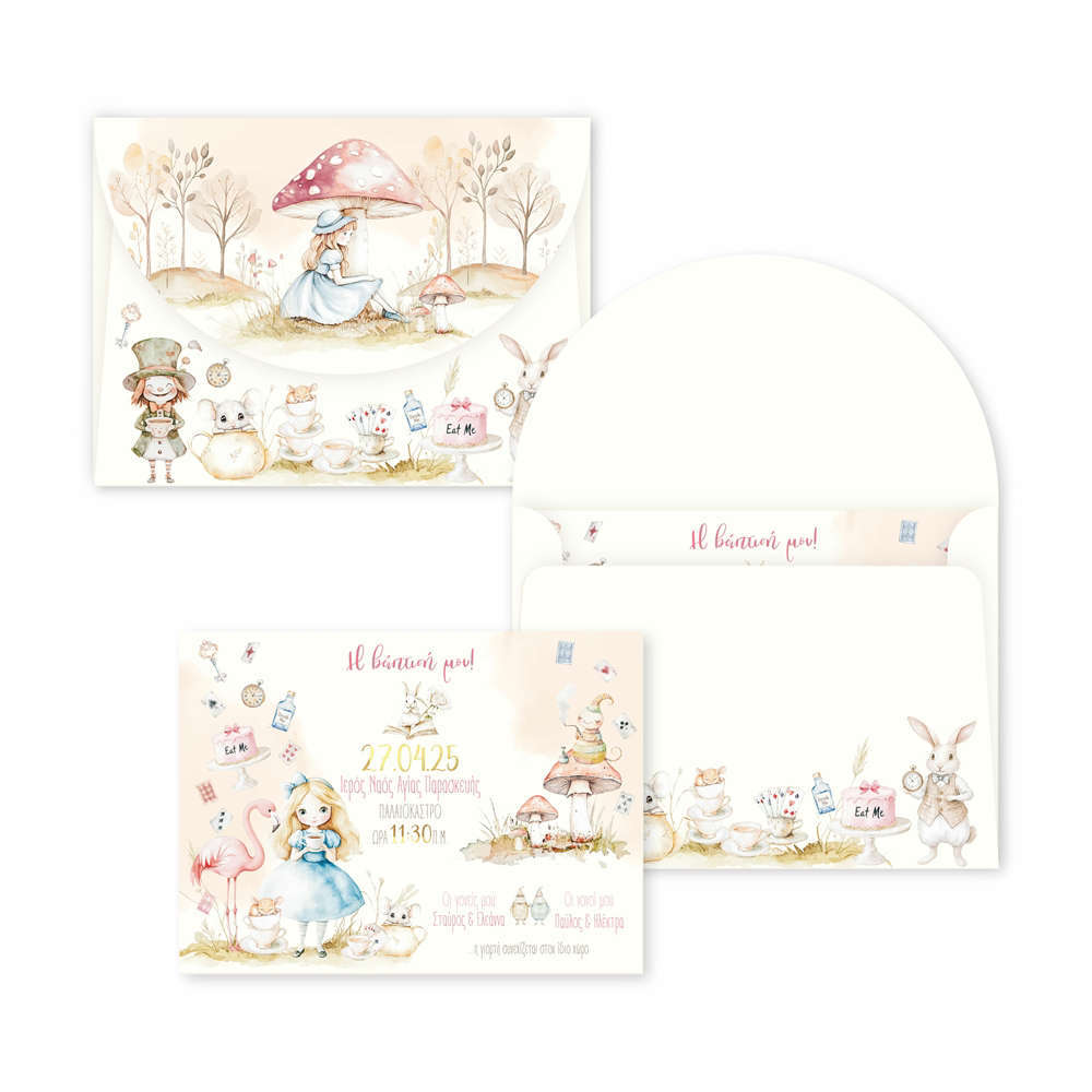 Το εκτυπωμένο προσκλητήριο βάπτισης για κορίτσι με θέμα Alice in Wonderland δημιουργεί ένα μαγικό και παραμυθένιο σκηνικό, εμπνευσμένο από τον κόσμο της Αλίκης στην χώρα των θαυμάτων. Με κομψές εικονογραφήσεις, ρομαντικές λεπτομέρειες και απαλή χρωματική παλέτα, αποτελεί την ιδανική επιλογή για μια βάπτιση γεμάτη φαντασία και ονειρική ατμόσφαιρα. Το προσκλητήριο μπορεί να προσωποποιηθεί πλήρως με το όνομα του παιδιού, την ημερομηνία, την ώρα και το κείμενο της βάπτισης, ώστε να ταιριάζει απόλυτα στο ύφος της εκδήλωσης. Εκτυπώνεται σε ποιοτικό χαρτί υψηλής αισθητικής, προσφέροντας άψογο αποτέλεσμα και μια ξεχωριστή πρώτη εντύπωση που θα μείνει αξέχαστη στους καλεσμένους σας.