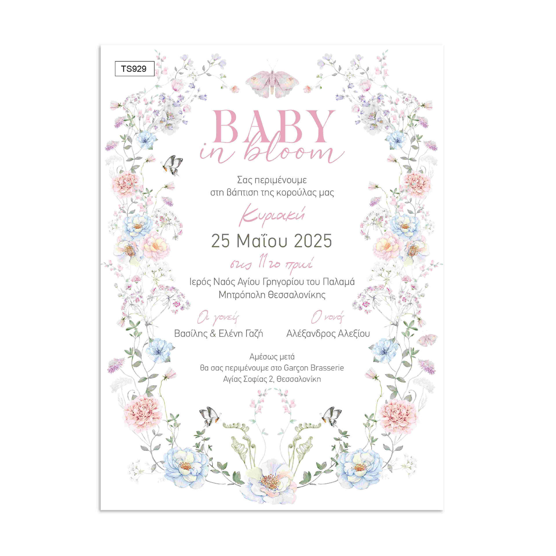 Το προσκλητήριο βάπτισης για κορίτσι “Baby in Bloom” γιορτάζει την πιο όμορφη άνθιση της ζωής σας. Με κεντρικό θέμα ένα πλούσιο, χειροποίητο στεφάνι από λουλούδια σε απαλές αποχρώσεις του ροζ, του γαλάζιου και του λιλά, το σχέδιο αποπνέει φρεσκάδα, ρομαντισμό και παιδική αθωότητα. Οι λεπτομέρειες από πεταλούδες που πετούν ανάμεσα στα άνθη και η κομψή γραμματοσειρά σε ροζ τόνους δημιουργούν ένα αισθητικό αποτέλεσμα υψηλής ποιότητας. Η τεχνική της ακουαρέλας δίνει μια καλλιτεχνική πινελιά στο προσκλητήριο, κάνοντας το να μοιάζει με μικρό πίνακα ζωγραφικής. Το θέμα "Baby in Bloom" είναι η ιδανική επιλογή για ανοιξιάτικες και καλοκαιρινές βαπτίσεις, προσφέροντας μια αίσθηση φυσικής ομορφιάς και κομψότητας. Το προσκλητήριο εκτυπώνεται σε premium χαρτί με εξαιρετική υφή, διατηρώντας τη ζωντάνια των παστέλ χρωμάτων. Είναι πλήρως προσωποποιήσιμο, επιτρέποντάς σας να μοιραστείτε όλες τις λεπτομέρειες της σημαντικής αυτής ημέρας με έναν τρόπο που θα μείνει χαραγμένος στη μνήμη των καλεσμένων σας.