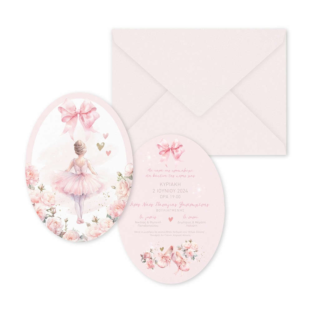 Ρομαντικό οβάλ προσκλητήριο βάπτισης για κορίτσι με θέμα "Μπαλαρίνα". Διαθέτει watercolor εικονογράφηση με τριαντάφυλλα, πουέντ και χρυσές λεπτομέρειες, συνοδευόμενο από πολυτελή ροζ φάκελο με ανάγλυφο σχέδιο. Μια αριστοκρατική επιλογή με premium αισθητική για μια ονειρεμένη πρώτη επίσημη εμφάνιση.