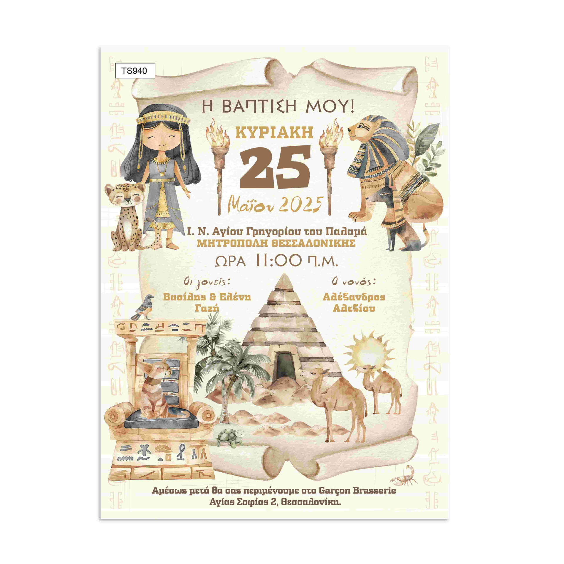 Το προσκλητήριο βάπτισης για κορίτσι “Egyptian Princess” ταξιδεύει τους καλεσμένους σας στην αίγλη της Αρχαίας Αιγύπτου μέσα από ένα ευφάνταστο και πρωτότυπο σχέδιο. Πάνω σε έναν εικονογραφημένο πάπυρο, η μικρή "Κλεοπάτρα" πλαισιώνεται από επιβλητικές πυραμίδες, σφίγγες, καμήλες και ιερογλυφικά σύμβολα, όλα αποτυπωμένα με ζεστές γήινες και χρυσές αποχρώσεις. Είναι η ιδανική επιλογή για γονείς που αναζητούν ένα θεματικό προσκλητήριο με έντονο χαρακτήρα και ιστορική αύρα, συνδυάζοντας την παιδική εικονογράφηση με το μυστήριο και τη μεγαλοπρέπεια του αρχαίου κόσμου.