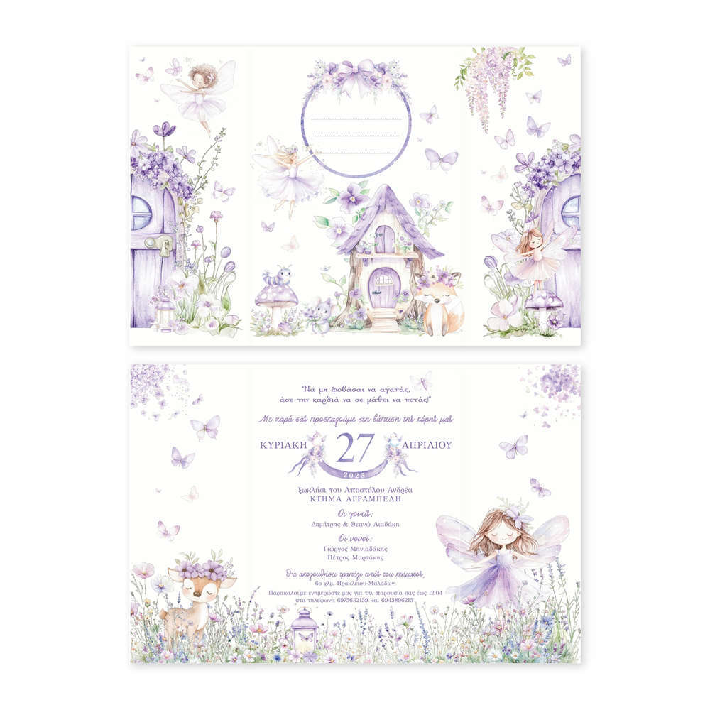 Οι απαλές λιλά και παστέλ αποχρώσεις προσδίδουν κομψότητα και ρομαντισμό, καθιστώντας το ιδανικό για βάπτιση κοριτσιού με παραμυθένιο ή floral concept. Το προσκλητήριο προσφέρει πλήρη δυνατότητα προσωποποίησης των στοιχείων της βάπτισης, ενώ η ποιοτική εκτύπωση αναδεικνύει κάθε λεπτομέρεια του σχεδίου.