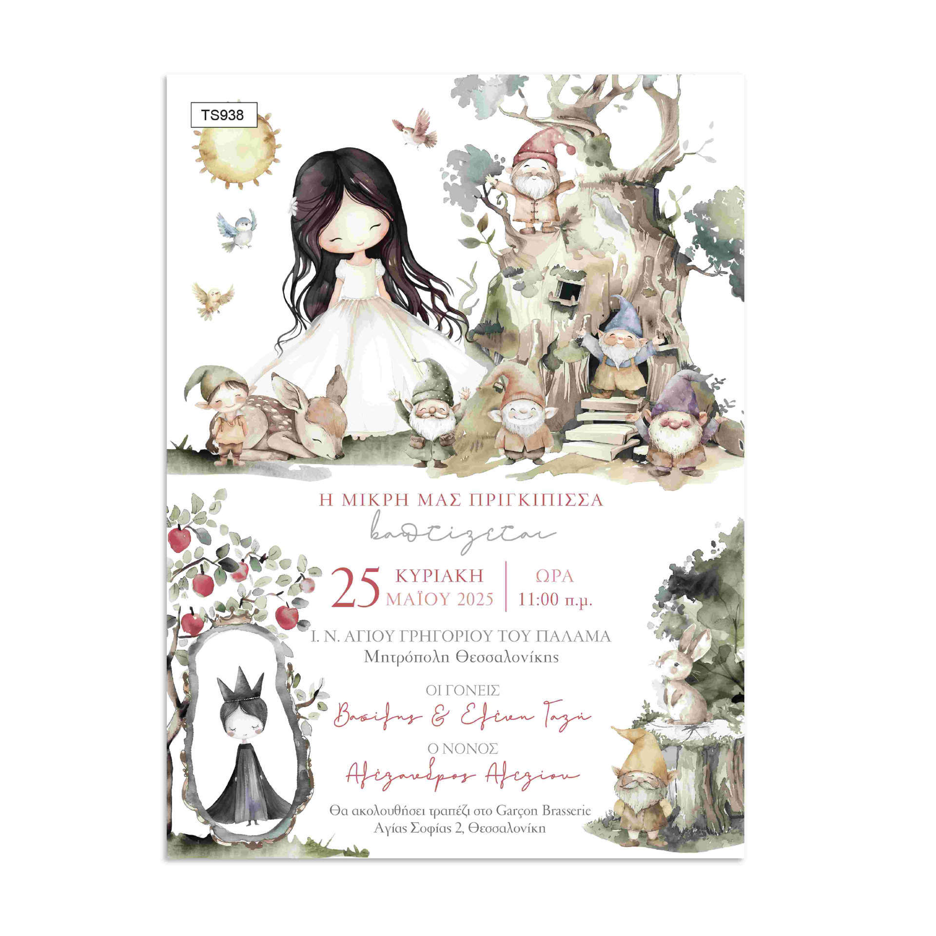 Το προσκλητήριο βάπτισης για κορίτσι “Snow White & the 7 Dwarfs” ζωντανεύει το πιο αγαπημένο παραμύθι των παιδικών μας χρόνων για τη δική σας μικρή πριγκίπισσα. Η εικονογράφηση σε στυλ απαλής ακουαρέλας απεικονίζει τη Χιονάτη περιτριγυρισμένη από τους επτά χαρούμενους νάνους, ένα γλυκό ελαφάκι και πουλάκια του δάσους μπροστά από το σπιτάκι τους, ενώ οι λεπτομέρειες με το μαγικό καθρέφτη και τα κόκκινα μήλα ολοκληρώνουν το θεματικό σκηνικό. Οι γήινες αποχρώσεις του δάσους συνδυάζονται άψογα με το λευκό και το απαλό ροζ, προσφέροντας ένα αποτέλεσμα γεμάτο μαγεία και νοσταλγία που θα ενθουσιάσει τους καλεσμένους σας.