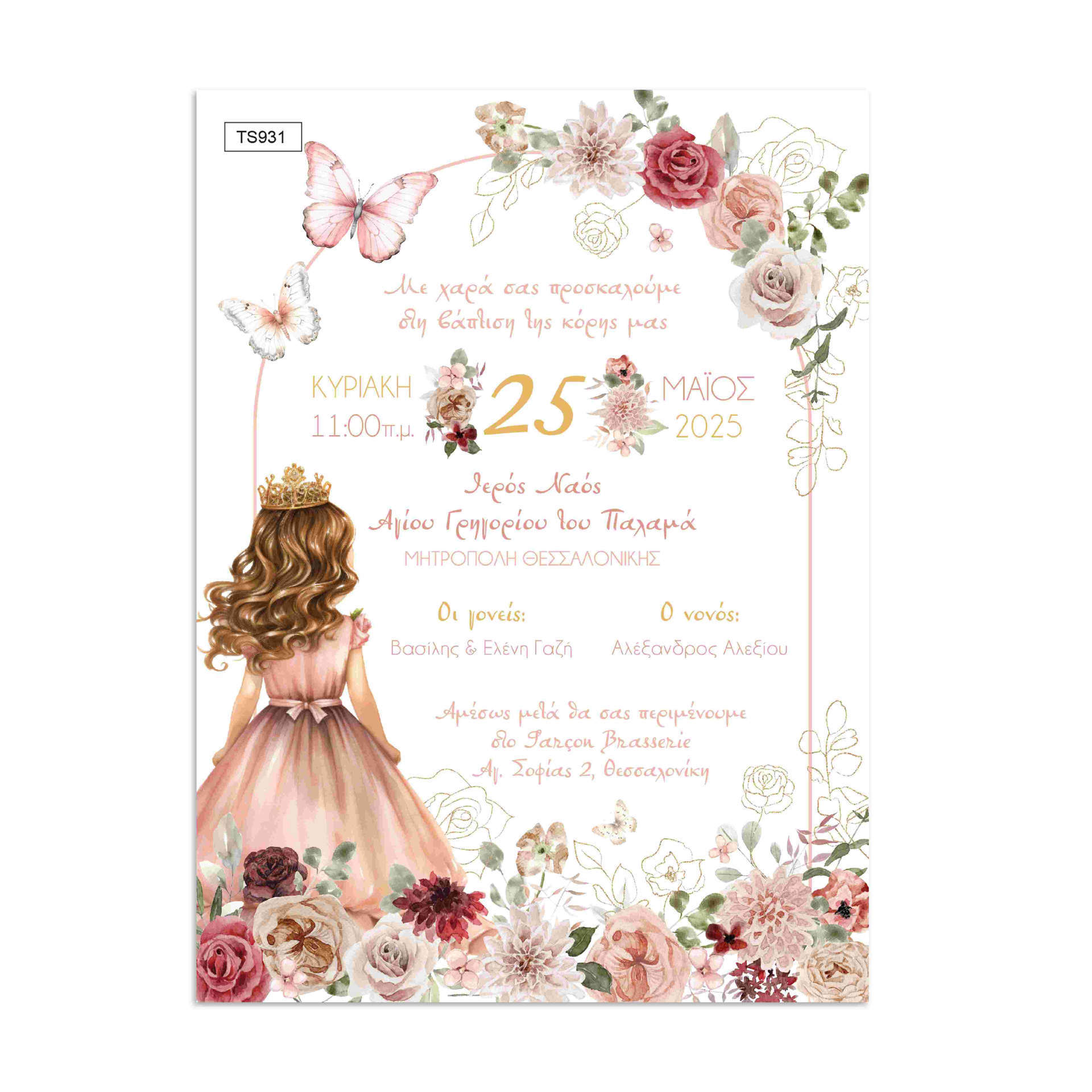 Ρομαντικό προσκλητήριο βάπτισης με θέμα πριγκίπισσα και λουλούδια. Κομψός, παραμυθένιος σχεδιασμός για μια αξέχαστη βάπτιση κοριτσιού.