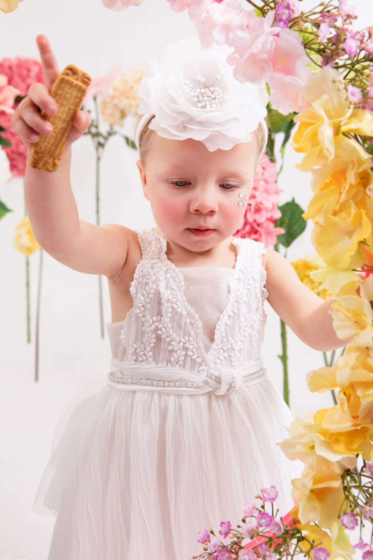 Η Iokasti είναι ένα off white πλισέ φόρεμα βάπτισης εξαιρετικής ποιότητας. Η κεντητή γαλλική δαντέλα στο μπούστο το απογειώνει και η στέκα με το τεράστιo handmade λουλούδι το ολοκληρώνει.