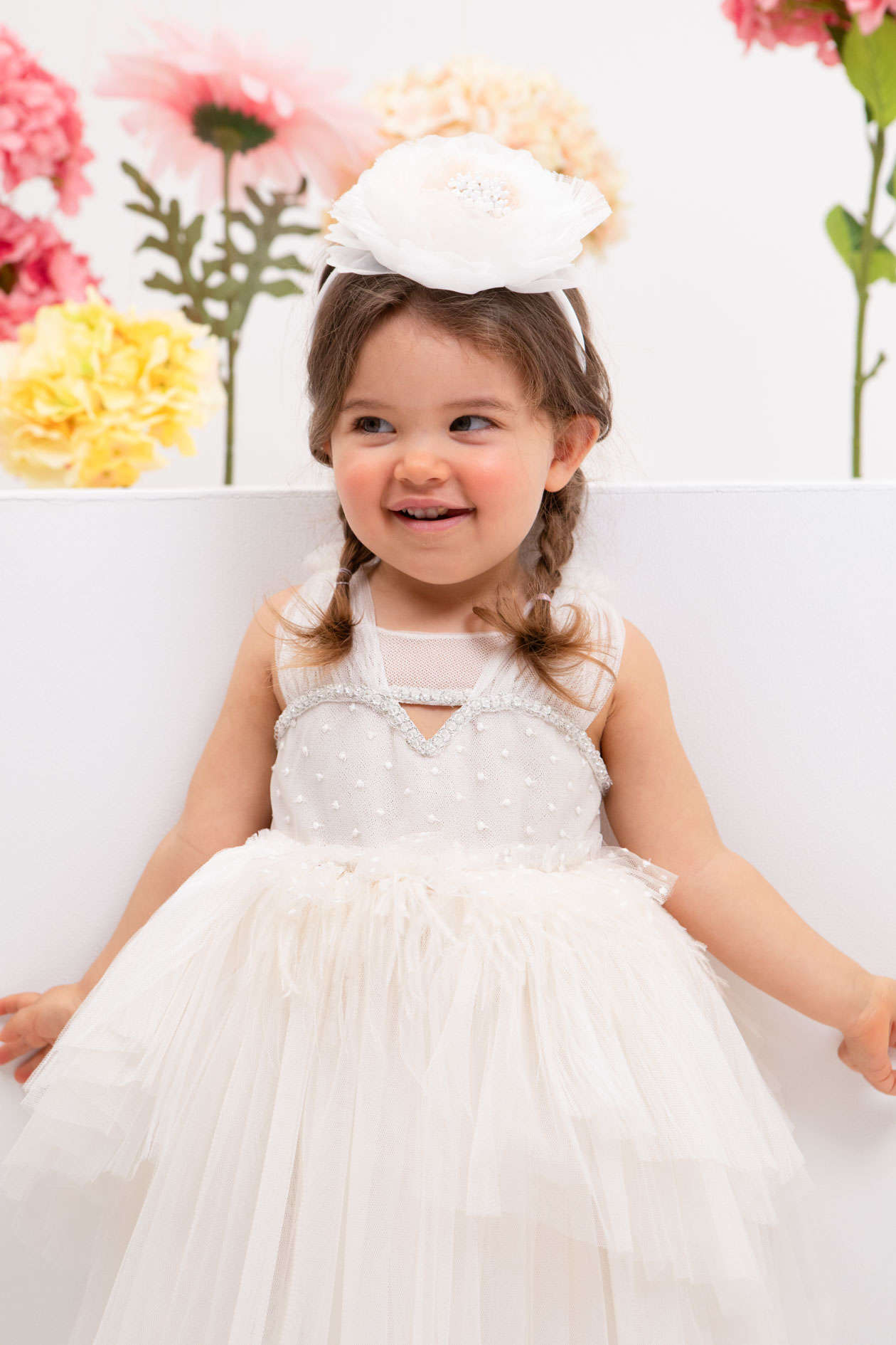 Η Myrsini είναι ένα βαπτιστικό σύνολο σε ιβουάρ αποχρώσεις. Το chic μπούστο του σε σχήμα καρδιάς το κάνει ξεχωριστό και τα πουπουλάκια του το κάνουν παιχνιδιάρικο. Το σύνολο ολοκληρώνεται με στέκα με χειροποίητο λουλούδι.