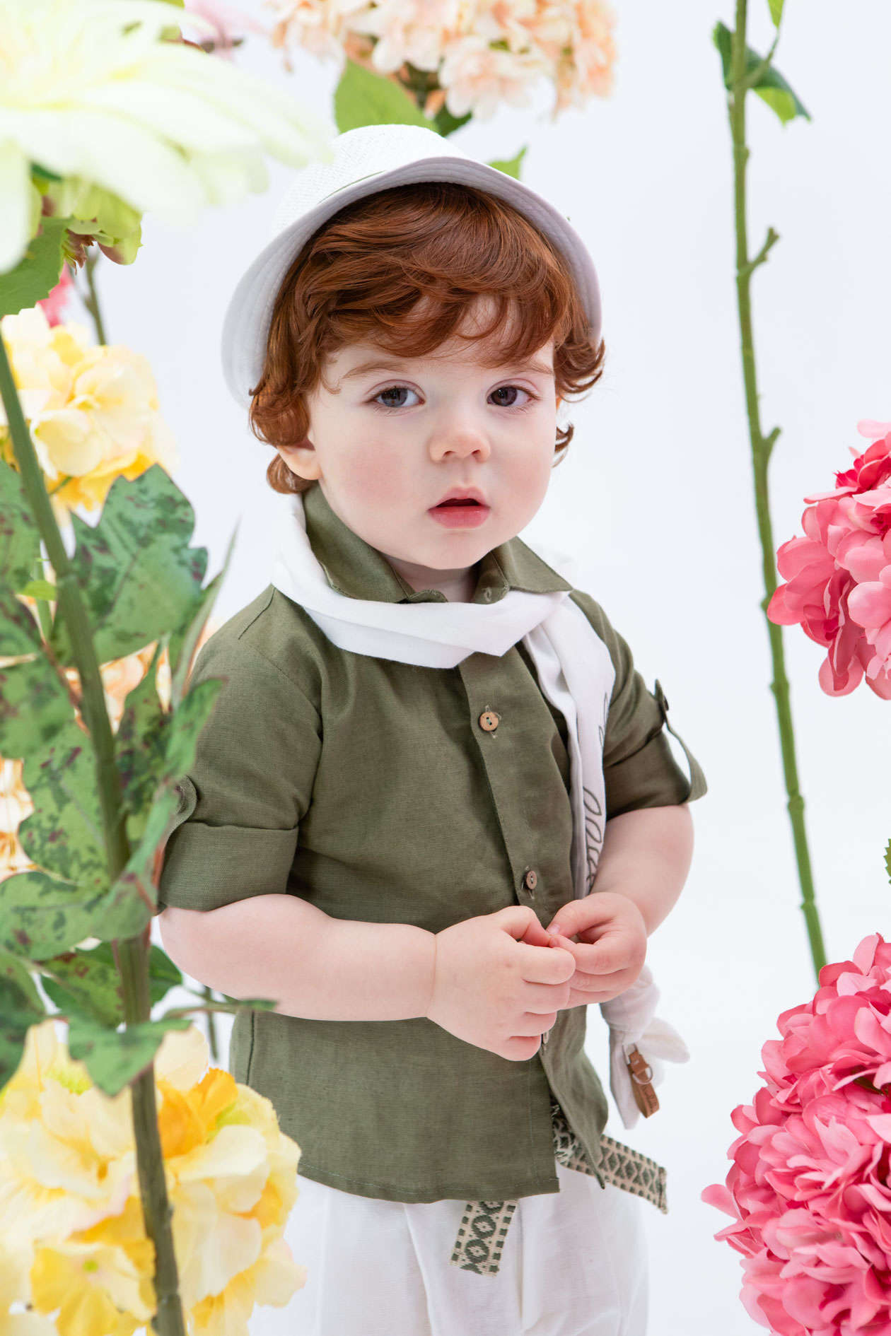 classy λευκό φουλάρι με λαδί κεντήμα, η ζώνη και το λευκό καβούρι του.