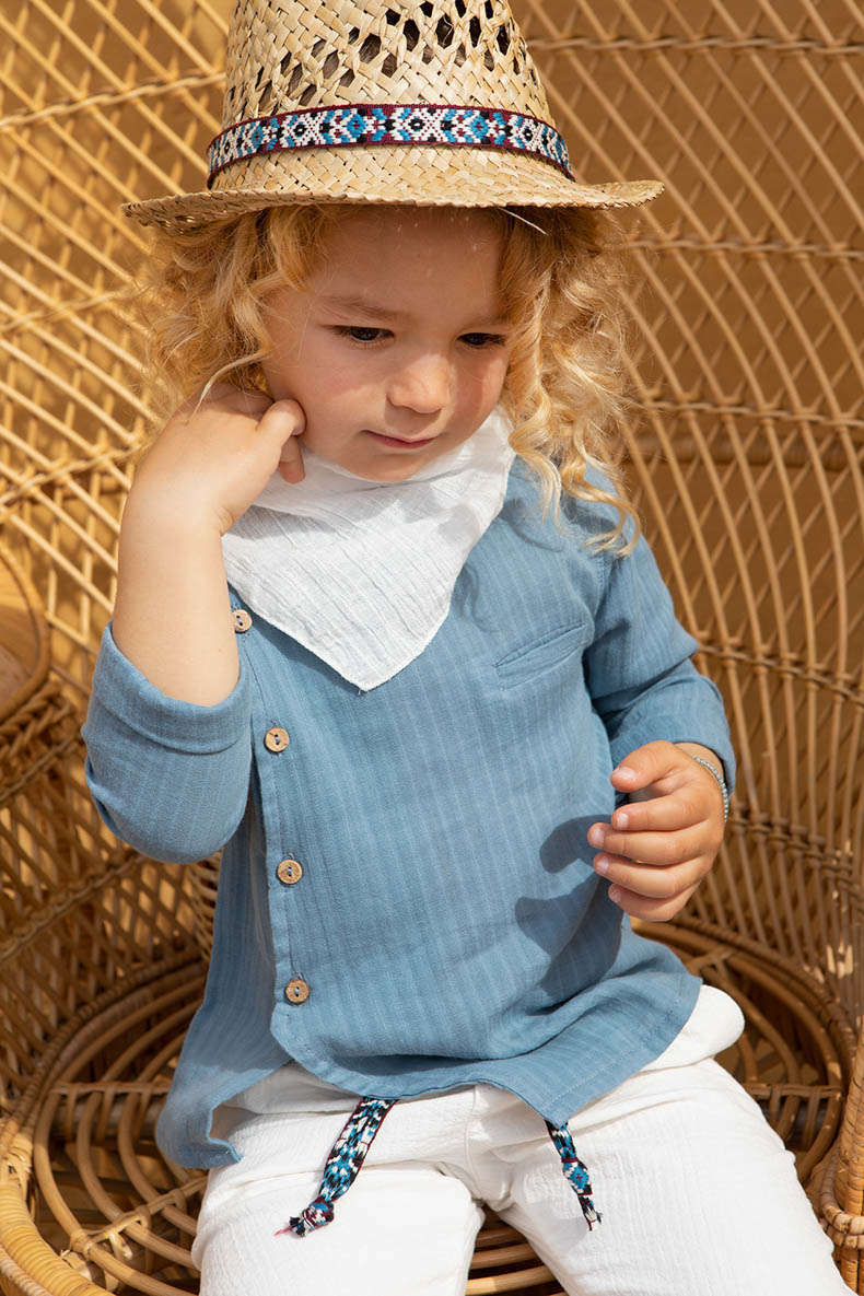 Ο Bruce είναι ένα chic and modern βαπτιστικό σετ. Αποτελείται από το στραβό μπλε πουκάμισο εξαιρετικής ποιότητας που θα λατρέψετε και το μαλακό εκρού παντελόνι το οποίο είναι διακοσμημένο με όμορφα κουμπιά. Το σετ ολοκληρώνει το εκρού φουλάρι, η ιδιαίτερη ζώνη και και το καπέλο καβουράκι.