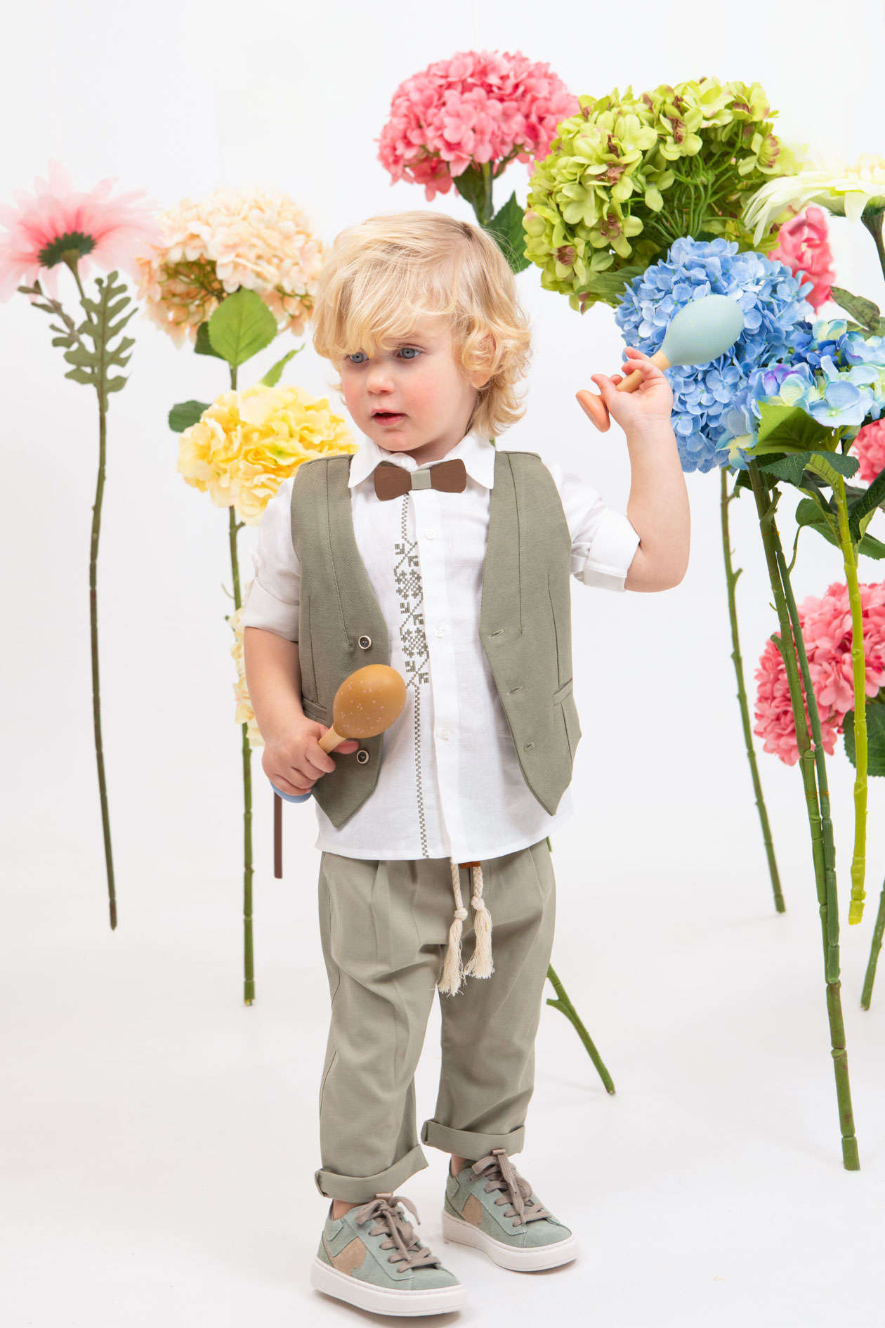 chic κουμπιά που το ολοκληρώνουν αρμονικά. Αξεσουάρ είναι το ξύλινο παπιγιόν, το εκρού-μπεζ