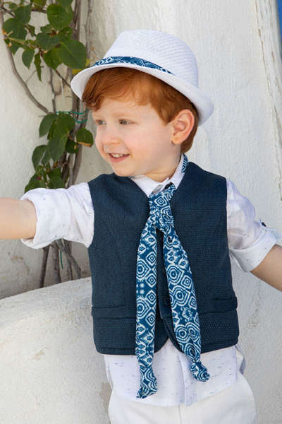 Ο Moses είναι ένα stylish bambolino boy σε λευκή-μπλε απόχρωση. Αποτελείται από λευκό παντελόνι, λευκό πουκάμισο με σχέδιο και μπλε γιλέκο εξαιρετικής ποιότητας το οποίο είναι διακοσμημένο με κουμπιά. Αξεσουάρ είναι η μπλε δερμάτινη ζώνη, η μπλε γραβάτα με σχέδιο και το καπέλο καβουράκι.