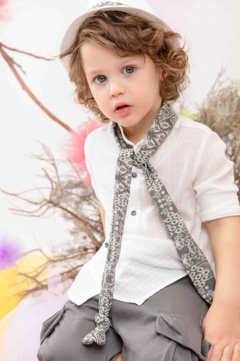 Ο Silver είναι μία chic version της νέας βαπτιστικής τάσης που έχετε αγαπήσει πολύ. Αποτελείται από μολυβί cargo παντελόνι με φοβερή εφαρμογή και λευκό οργανικό cotton πουκάμισο με νταμάκια που θα δώσει λάμψη στην εικόνα του παιδιού σας. Αξεσουάρ είναι το εκρού κορδόνι για ζώνη, το μολυβί φουλάρι με σχέδιο και το καπέλο καβουράκι.