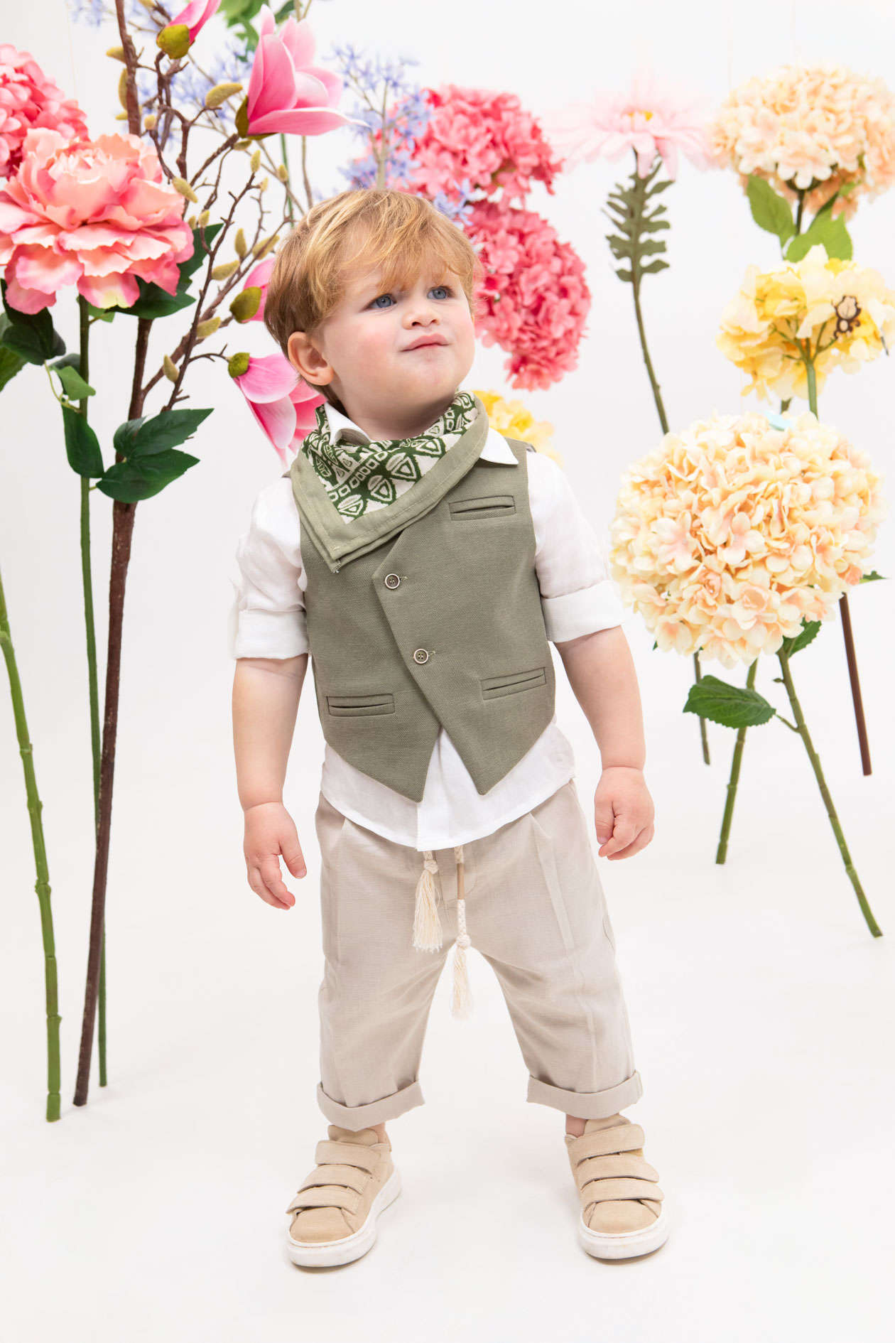λινό παντελόνι με πιέτες και λάστιχο στην μέση, εκρού λινό πουκάμισο και στραβό λαδί γιλέκο το οποίο