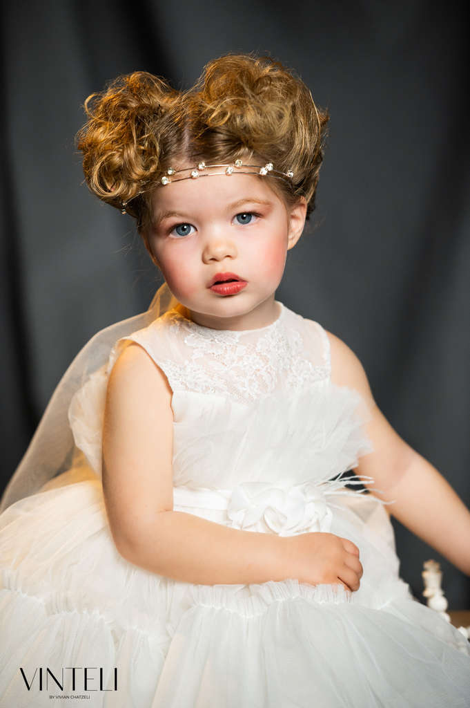 Φόρεμα μεσάτο με βολάν βεντάλια στο μπούστο και κεντημένη δαντέλα με χάντρες στους ώμους και στην πλάτη. Το φόρεμα διακοσμείται από ιβουάρ σατέν λεπτό ζωνάκι και χειροποίητα σατέν λουλούδια με φτερά. Συνοδεύεται από μεταλλική τιάρα για τα μαλλιά. Σετ 2 τεμαχίων.