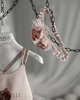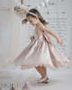 Στο κορσάζ, δίπλα ραντάκια από το μπροστινό μέρος, καταλήγουν στο πίσω με χιαστί δέσιμο. Το φόρεμα στολίζεται στο πίσω μέρος με έναν διπλό εντυπωσιακό φιόγκο και στο εμπρός με χειροποίητα λουλούδια πέταλο σε ίδια απόχρωση. Συνδυάζεται με κλειστή ελαστική κορδέλα για τα μαλλιά με ασορτί ντεκόρ.